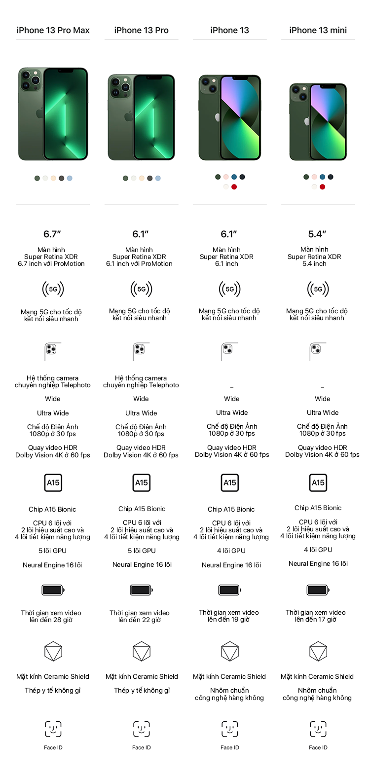 Cần có gói cước dữ liệu. Mạng 5G chỉ khả dụng ở một số thị trường và được cung cấp qua một số nhà mạng. Tốc độ có thể thay đổi tùy địa điểm và nhà mạng. Để biết thông tin về hỗ trợ mạng 5G, vui lòng liên hệ nhà mạng và truy cập apple.com/iphone/cellular. Màn hình có các góc bo tròn theo đường cong tuyệt đẹp và nằm gọn theo một hình chữ nhật chuẩn. Khi tính theo hình chữ nhật chuẩn, kích thước màn hình là 6.06 inch theo đường chéo. Diện tích hiển thị thực tế nhỏ hơn. Thời lượng pin khác nhau tùy theo cách sử dụng và cấu hình. Truy cập apple.com/batteries để biết thêm thông tin. iPhone 13 có khả năng chống nước, chống tia nước và chống bụi. Sản phẩm đã qua kiểm nghiệm trong điều kiện phòng thí nghiệm có kiểm soát đạt mức IP68 theo tiêu chuẩn IEC 60529. Khả năng chống tia nước, chống nước và chống bụi không phải là các điều kiện vĩnh viễn. Khả năng này có thể giảm do hao mòn thông thường. Không sạc pin khi iPhone đang bị ướt. Vui lòng tham khảo hướng dẫn sử dụng để biết cách lau sạch và làm khô máy. Không bảo hành sản phẩm bị hỏng do thấm chất lỏng. Một số tính năng không khả dụng tại một số quốc gia hoặc khu vực.