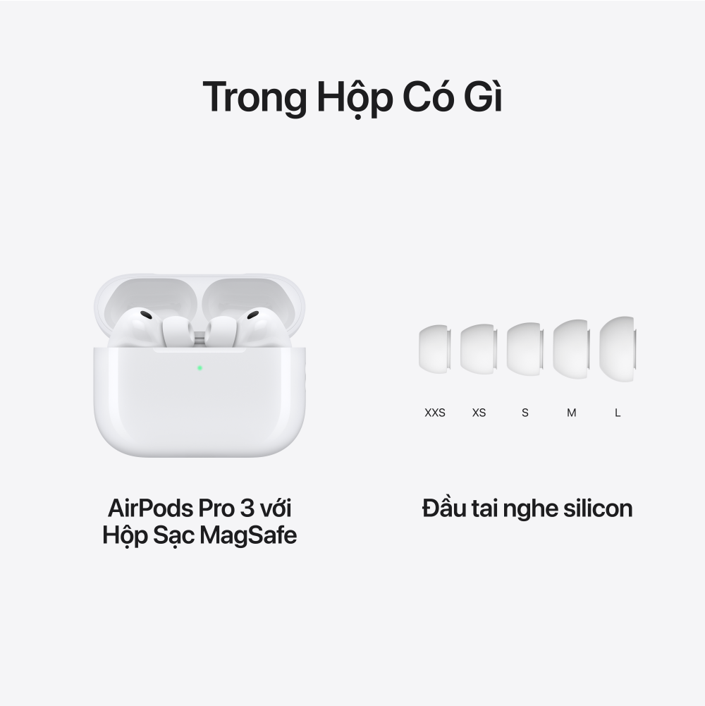 AirPods Pro 3. Chủ Động Khử Tiếng Ồn hiệu quả hơn đến 2 lần so với AirPods Pro 2.1 Nay với tính năng cảm biến nhịp tim,2 thời lượng pin lâu hơn,3 và những bước tiến lớn về sức khỏe thính giác. Được thiết kế mới cho cảm giác vừa vặn hơn.3
